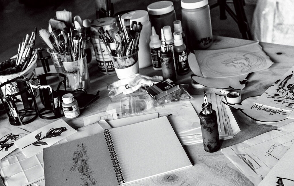 教科書の偉人の写真に落書きをしたり、ノートの端っこに誰かの似顔絵を描いてみたり、そんな子どものころのままの気持ちで絵を描き続けてきた。教科書やノートは、キャンバスに変わったが、絵を描くときの楽しさは、いまも変わらない。絵を描いているとき、僕の心は時空を超えて自由に飛び回る。そして手は心の動きを追いかけ、絵の具をつかってキャンバスに軌跡を残す。そうやって1枚の絵が完成したとき、なんともいえない幸福を感じる。