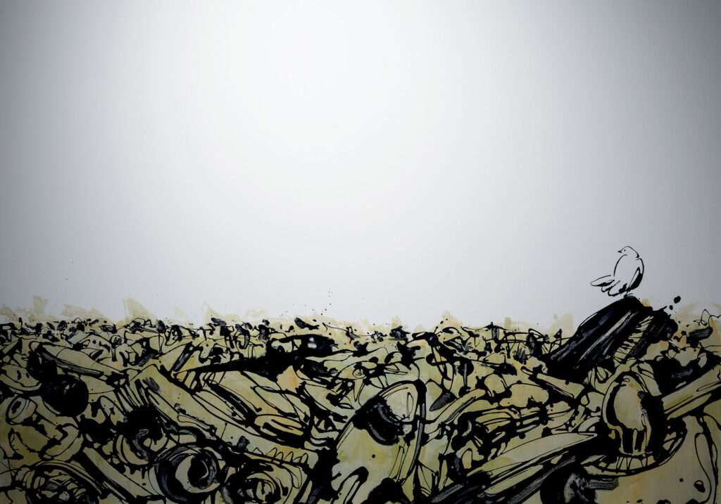 「答えは風に吹かれている(The answer is browin’ in the wind)」という歌詞に象徴され るように、この曲は反戦という強い意志に裏打ちされていながらも、決して絶対的な「答え」を聴く者に押し付けてこない。SUDOの作品も同様に、政治的批評性に立脚しつつも、一方的なメッセージとして響くことはない。今回の展示でのメイン・ピースには、彼のシグニチャーである「ボタンフラワー」と一緒に「鳩」が描かれている。平和の象徴として頻繁に使用される「花」や「鳩」というモチーフを用いた表現は、かなり直接的なメタファーであると言えるが、それを自分なりにアレンジしたそうした率直な選択からは、むしろ作家の切迫した感情が伝わってくるようにも思われる。加えて、「ボタンフラワー」が収められている「花瓶」をよく見てみると、最前線で戦闘を行う兵士のヘルメットを逆さにしたようなギミックをしていることに気づく。そのほかにも、薬莢やバズーカ など殺戮の道具として製造された様々な兵器が、SUDOの巧みなアレンジとアプロプリエーションを通して本来の「用途」を失い、アートにおける新しいモチーフとして再生している。